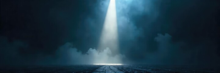 A single, powerful spotlight beam cuts through the darkness, illuminating a hazy atmosphere Perfect for concepts of hope, mystery, or dramatic effect , concentrated, ray, projector