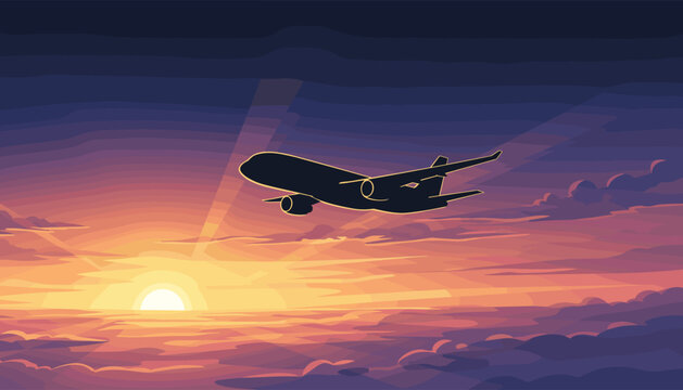 Silhouette of a commercial airplane soaring through a vibrant sunset sky, with dramatic sunbeams piercing through colorful clouds, evoking a sense of travel and adventure.