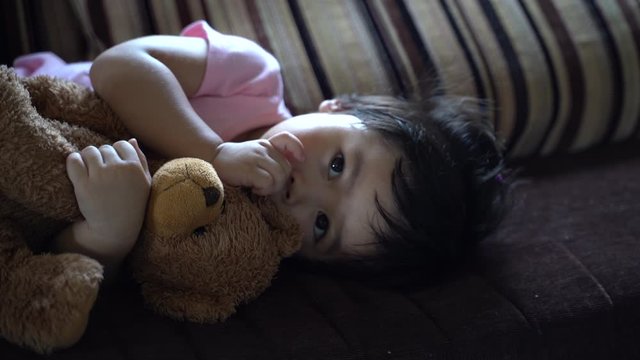 Top view of peaceful baby lying at sheets and sucking her finger. She is sleeping with teddy bear in an embrace