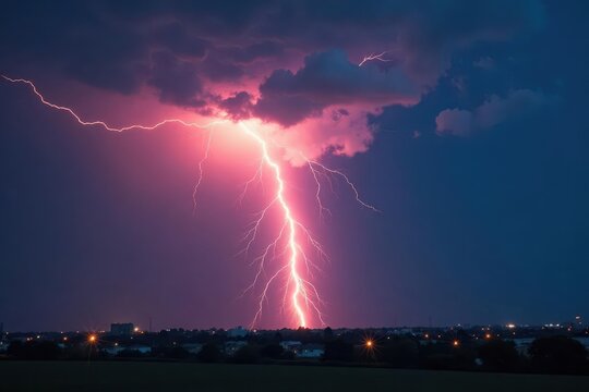 Fiery lightning strikes amidst towering thunderhead , fiery, illuminated