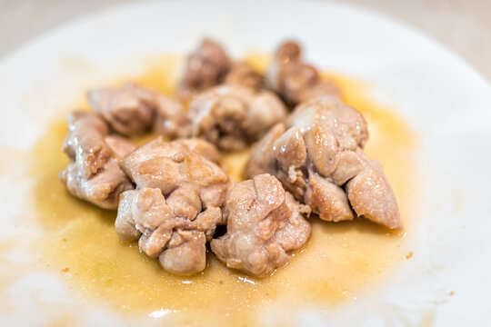 Macro closeup of fresh whole cooked fried beef sweetbreads thymus organ gland, nutritious ancestral meat homemade food on white plate on kitchen table