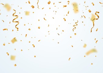 Golden flying blur confetti with motion effect on light white background . Template for Holiday vector illustration