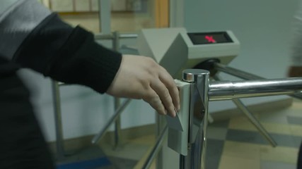 Men pass the electronic turnstile with plastic card at the office