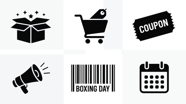 Vector icons set for sales and shopping promotions including box coupon cart barcode megaphone and calendar vector illustration white background
