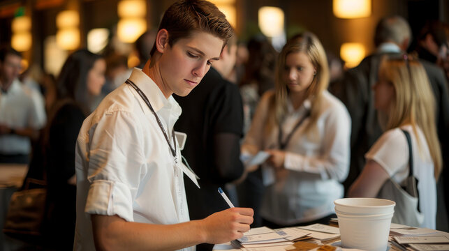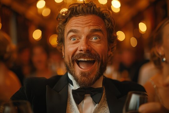 Surprised lucky 30-years old male attendee in formal clothes realizes that he holding winning ticket at a charity gala event after announcing raffle prize. The concept of victory, luck and success