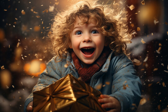 Happy kid as they receive a Christmas present, radiating the magic and innocence of the holiday season. Ai generated