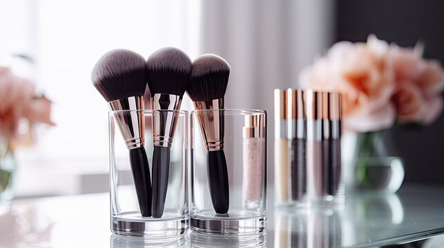A glass container with makeup brushes in it, is a versatile and stylish image suitable for beauty and cosmetics-related designs, including advertisements, websites, and social media.
