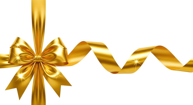 Golden ribbon bow on a white background with copy space, perfect for gift wrapping and celebrations