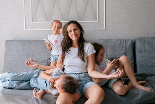 Tired young mother sits on couch and holds her head while her three naughty daughters play games on smartphones. lifestyle family together portrait.