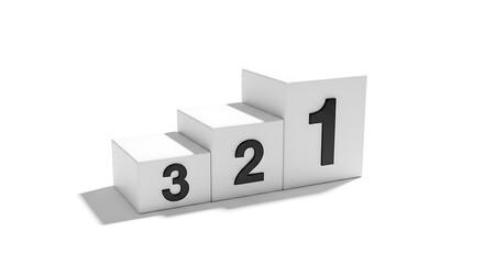 Three tiered white podium with black numbers one two and three on a white background winner first place