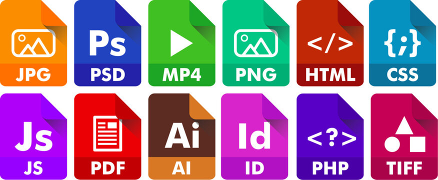 Collection of colorful digital file type icons for various applications