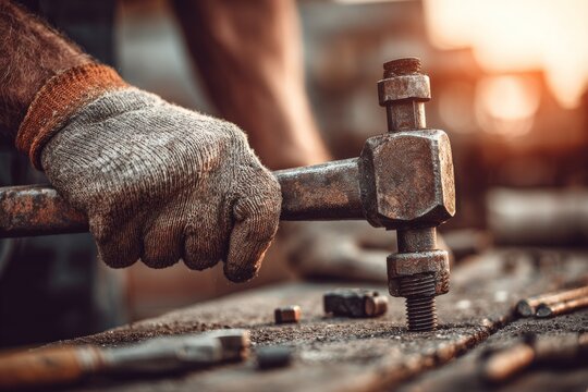worker’s gloved hands tightening steel pipe fittings using heavy tools