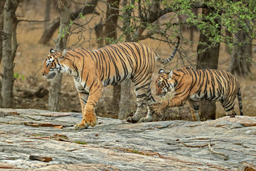 Mom tigress with two babies. Two little playing tiger cubs. Tiger family. Wild animals in nature