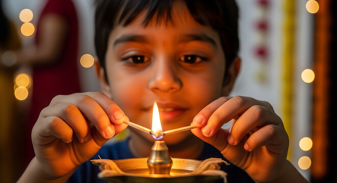 Indian boy with a focused expression lighting a diya lamp for Diwali festival against a bokeh background