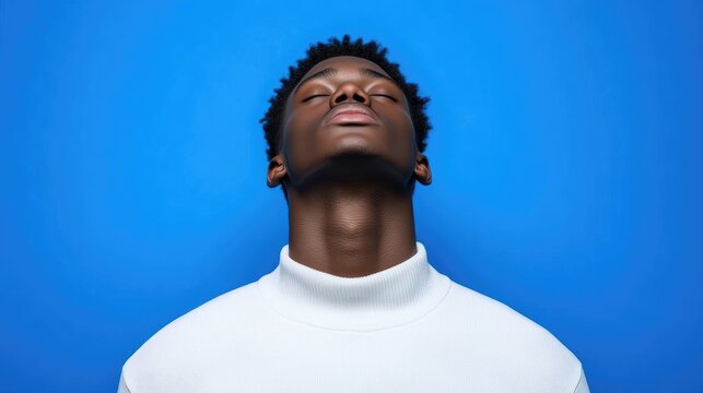 Close-up portrait of a young man with eyes closed, head tilted back, against a vibrant blue background, wearing a white turtleneck