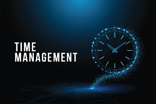 Time Management Concept: A creative, low-poly illustration depicts the essence of time management with a clock face composed of interconnected points and a trail of digital particles.