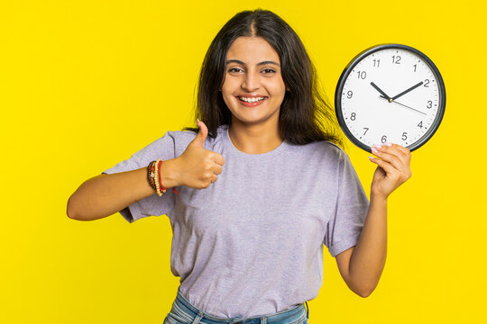 It is your time, hurry up. Indian woman showing time on wall office clock, ok, thumb up, approve, pointing finger at camera, advertisement, deadline. Arabian girl isolated on studio yellow background