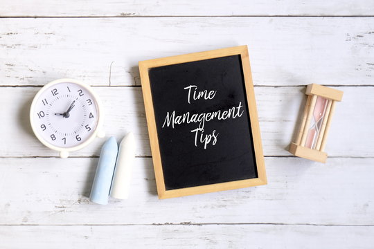Top view of chalk,table clock,hourglass and blackboard written with 'TIME MANAGEMENT TIPS' on white wooden background.