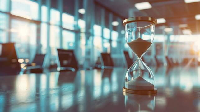 Pressure as a critical business deadline approaches in a bustling corporate environment. Hourglass and sand clock