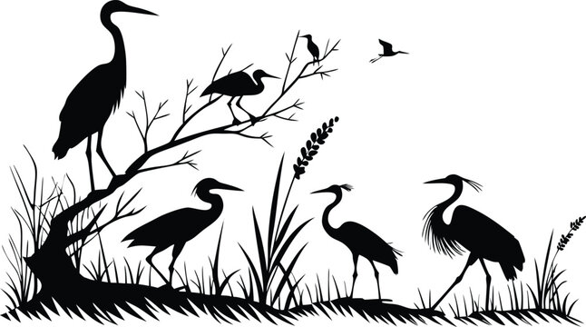 Elegant silhouette featuring a flock of herons amidst reeds, a timeless symbol of nature's grace suitable for diverse creative projects