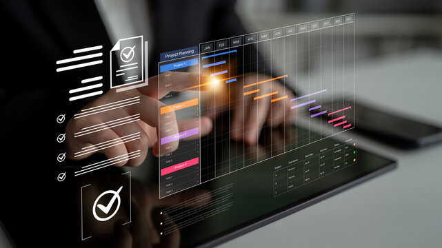 Business project management dashboard with digital Gantt chart, schedule timeline planning, task tracking, performance progress analysis, data visualization technology for corporate strategy and workf