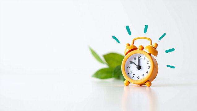 Flat design vector illustration of a traditional alarm clock showing three o'clock on a white background with colorful abstract shapes.