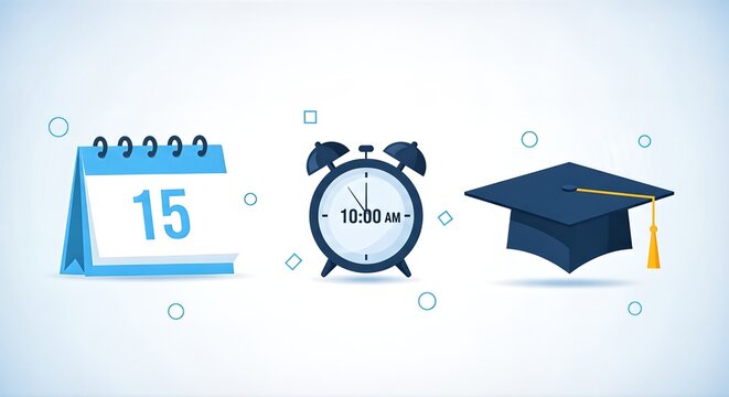 3d concept illustration of an education deadline school symbol with graduation cap and diploma near a business alarm clock to sign the hour