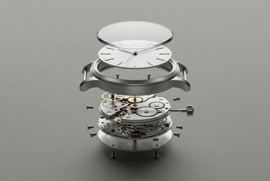 Wristwatch components in exploded view, floating metallic gears, silver case, glass crystal, white face, technical precision, neutral grey background