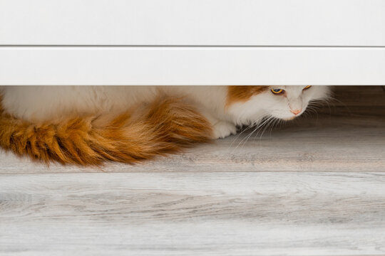 a timid cat hides under the cupboard. animal abuse. the cat is hiding from people