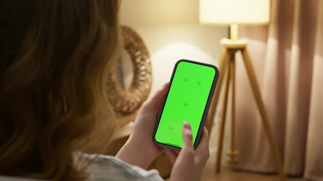 Woman sit use digital tech cell phone green screen mock up. Hand scroll phone tinder web site swipe, like right left. Girl hold mobile closeup. Chroma key page. Cozy background. Online app copy space