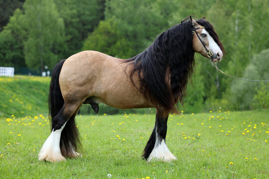 Tinker horse with a beautiful mane in summer green nature portrait