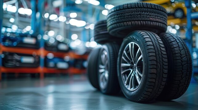 An auto repair service center is changing a tire for a customer. Change tires and install tires with experts with a background in an industrial and efficient car care center.