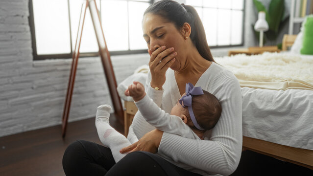 Woman yawning while holding baby girl in cozy bedroom showing tired mother with love indoors.