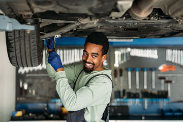 Mechanic working on car tire for automotive services promotion