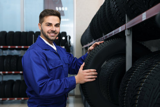 Black male Mechanic holding a tire and showing wheel tires at car repair service and auto store shop. Expertise mechanic working in automobile repair garage.