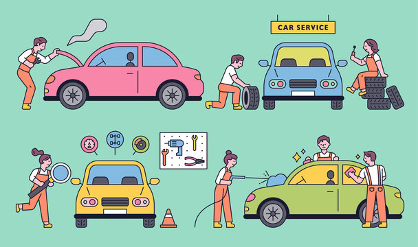 Auto check, car service shop concept. Automobile repairman writing job checklist on clipboard, mechanic checking engine to estimate repair machine, inspecting maintena