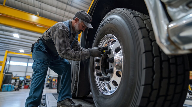 Truck maintenance: workers inspect tires. Safe roads start with vehicle checks. Regular inspections ensure roadworthiness, keeping drivers and cargo secure.