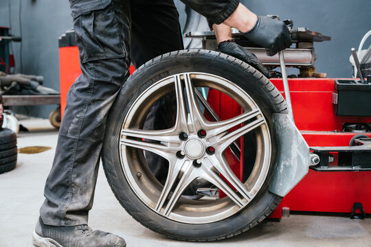 Mechanic repairing wheel on tire changing machine in auto repair shop