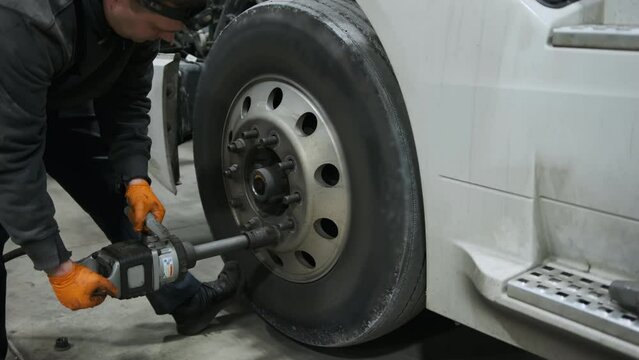 Close up shot of Worker makes repair wrench wheel tire truck closeup using tool