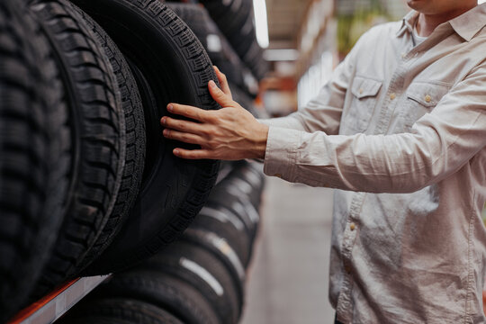 male customer choosing new tires in the supermarket .