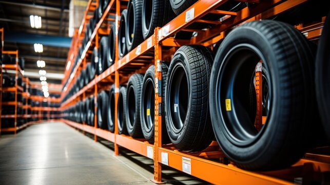 new car tire mix type on storage shelf at warehoue stock inventory in auto garage workshop for sale