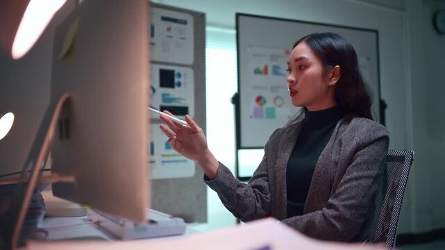 Caucasian young adult woman wearing glasses working at computer station in medical office analyzing brain scans on multiple monitors focusing on diagnostic imaging tasks