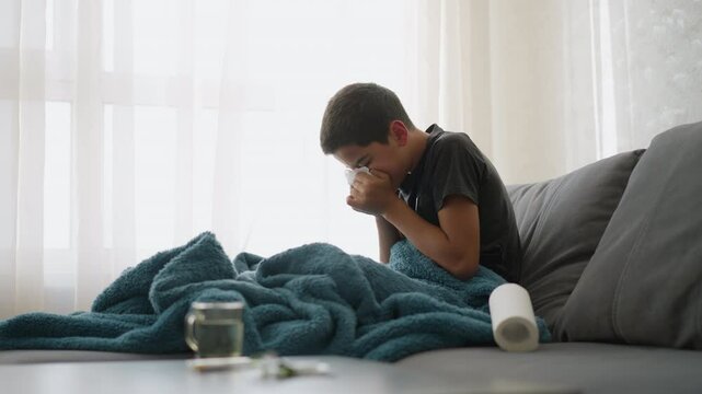 Sick young child sneezing into tissue on couch with blanket covering him, showing tiredness near window with glass cup on table, feeling unwell and needing rest to recover from cold