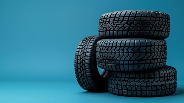 Advertisement banner for tire shop featuring pile of black rubber tires. Concept Tire Shop, Black Rubber Tires, Automotive Maintenance, Tire Replacement, Quality Service