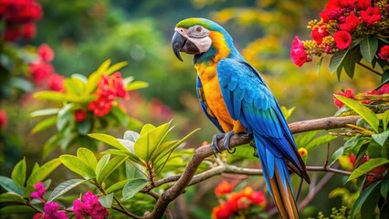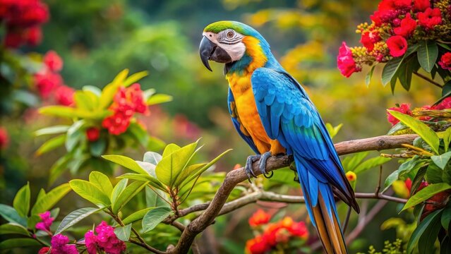 Blue and yellow Macaw perched on a branch of Chapada dos Veadeiros National Park's lush foliage amidst vibrant greenery and colorful tropical flowers , chapada, park