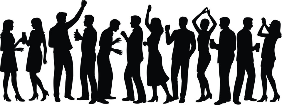 Silhouettes of people enjoying party, drinking, dancing, celebrating, nightlife fun, festive mood, group gathering, happy moments, social celebration.