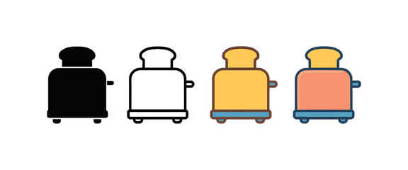 Vector icon kitchen toaster same pose same proportions four styles black solid glyph outline minimal flat multicolor filled cartoon flat shaded.