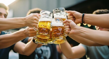 A group of friends raises large beer mugs in celebration at an outdoor festival - Oktoberfest concept