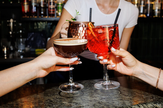 Close up of people drinking cocktails in restaurant. People having good time, cheering and drinking cold cocktails, enjoying friendship together in restaurant, close up view on hands.