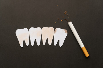 Cigarettes or tobacco with tooth shape on black background. Teeth problems caused by smoking include staining, gum disease and cavities. World no tobacco day concept template.